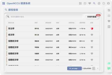 這個專案中我帶領團隊進行前端專案重構,擔任開發PM負責開發進度控制,並協同處理設計與後端溝通問題,包括:制定Component模板,前端資料結構設計後端資料驗證,快取加速搜尋CI/CD建構,自動發佈及部屬。專案原本依賴電算中心提供的Web API搜尋系統,利用腳本爬出資料,變成單純的資料庫搜尋,除了效能上的提升,也能更完整的搜尋到課程資料及客製化搜尋設定。